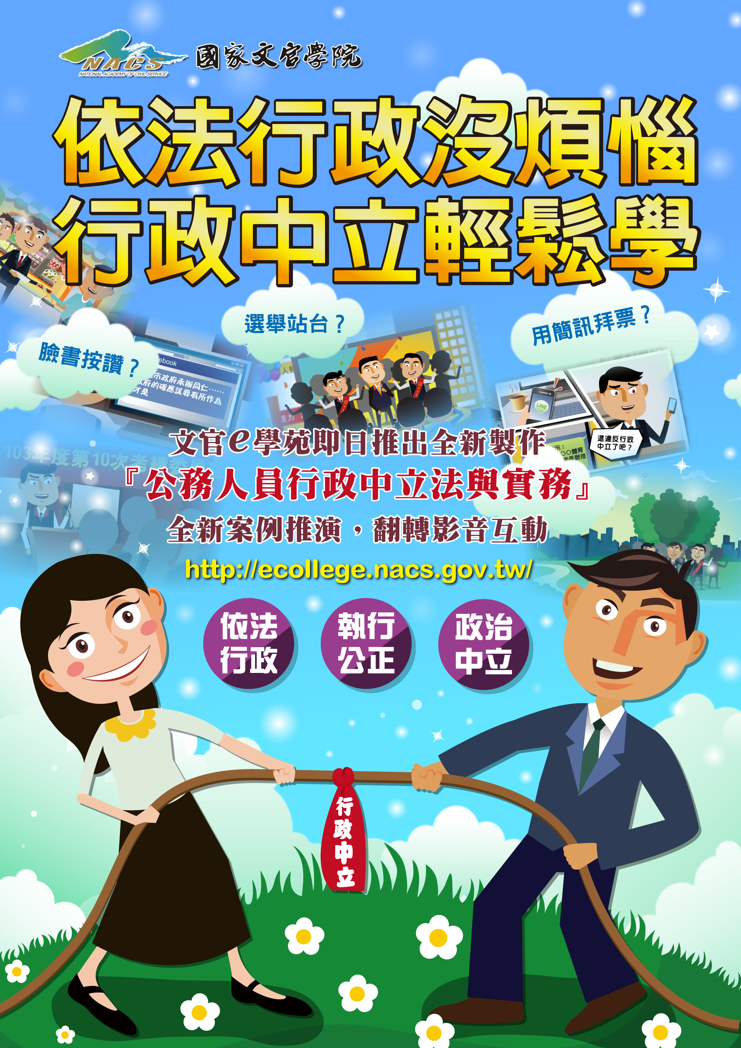 主旨:為強化公務人員對行政中立之認知,國家文官學院全新製作「公務人員行政中立法與實務」數位課程,請查照並鼓勵所屬踴躍上網學習。 說明: 一、依據國家文官學院 104 年 11 月 30 日國院數字第 1040800250 號書函辦理。 二、旨揭課程自即日起於「文官e學苑」行政中立學習專區上架( http://ecollege.nacs.gov.tw ),內容包括案例推演、翻轉影音互動模式,歡迎踴躍上網學習。 三、檢送課程宣導海報電子檔 1 份,惠請發送或列印張貼。