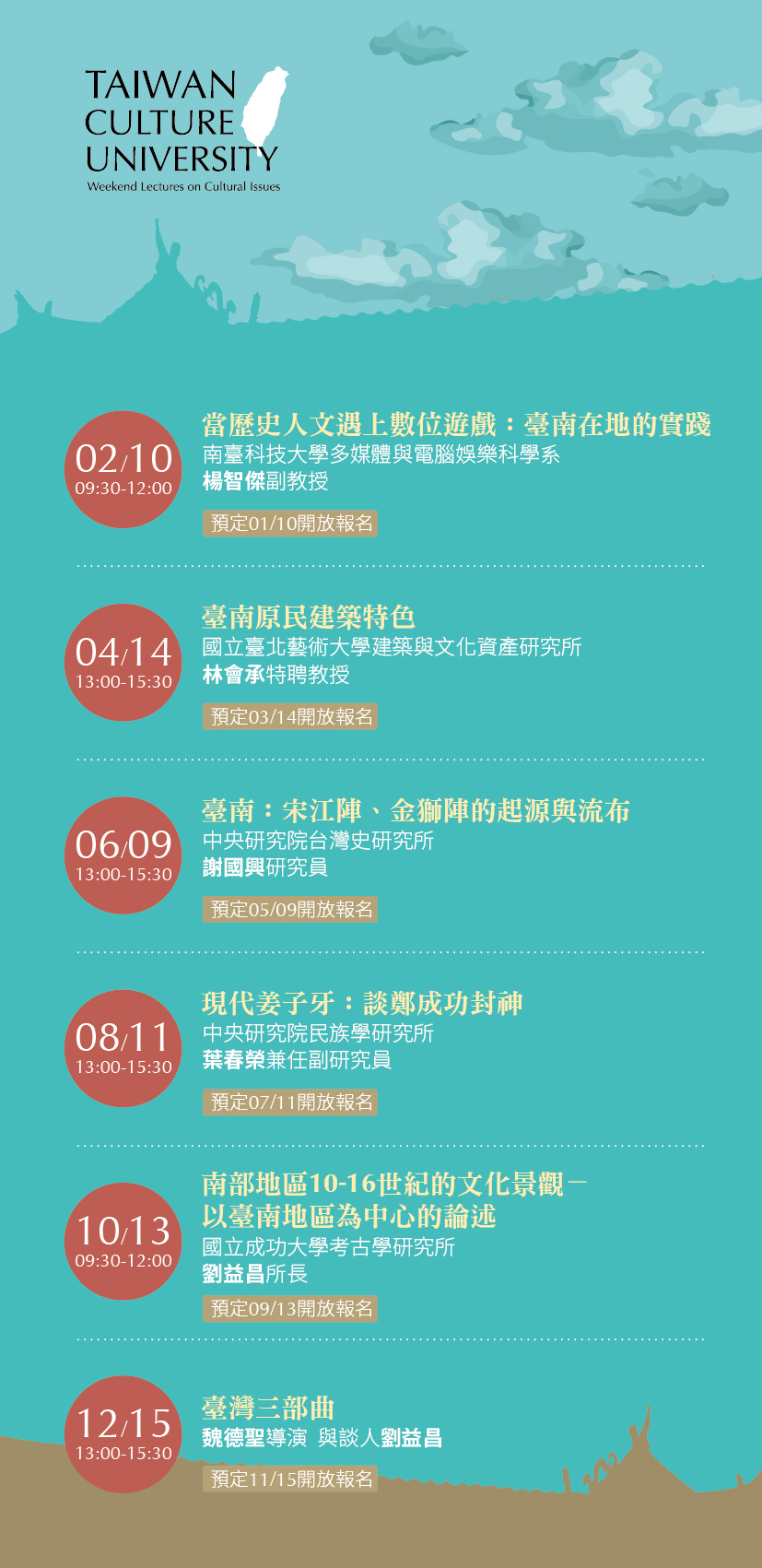 臺南市政府文化局為推廣臺南研究辦理「2018 臺灣文化大學週末文化講座」,歡迎報名參加,請查照。 說明: 一、臺灣文化大學週末文化講座旨在以探討大臺南地區文化為切入點,以每年雙數月辦理方式,安排深入淺出的教學方式,提升民眾對臺南歷史的認知。 二、課程報名方式為網路報名,請至臺灣文化大學官網(http://twcu.culture.tainan.gov.tw)線上報名專區填寫報名表。 三、相關課程請詳閱附件場次規劃表,主辦單位保留課程變動之權利,報名前請詳閱官網資訊。
