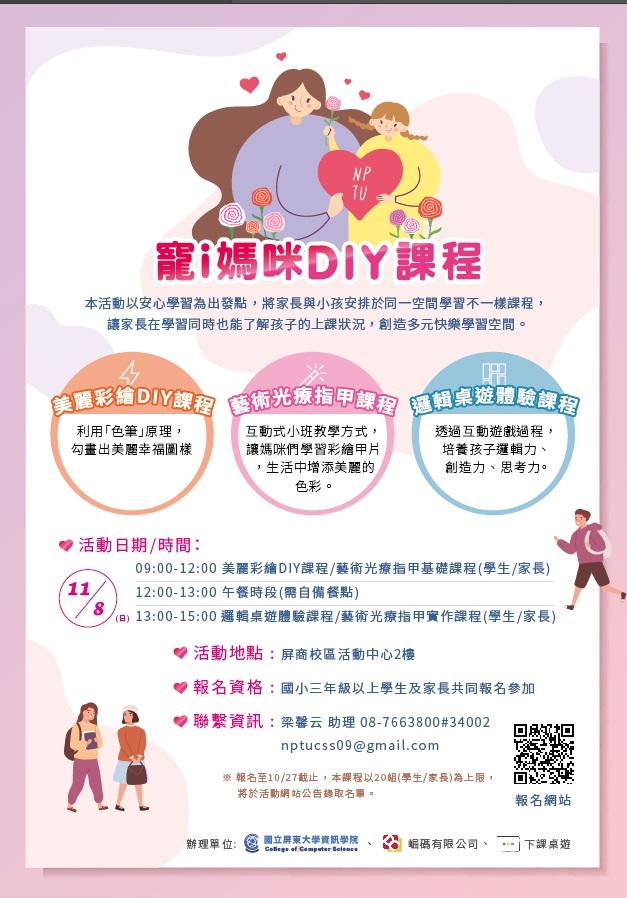 檢送屏東大學資訊學院辦理「寵i媽咪DIY課程」活動,敬請轉 知所屬師生踴躍報名參加,請查照。