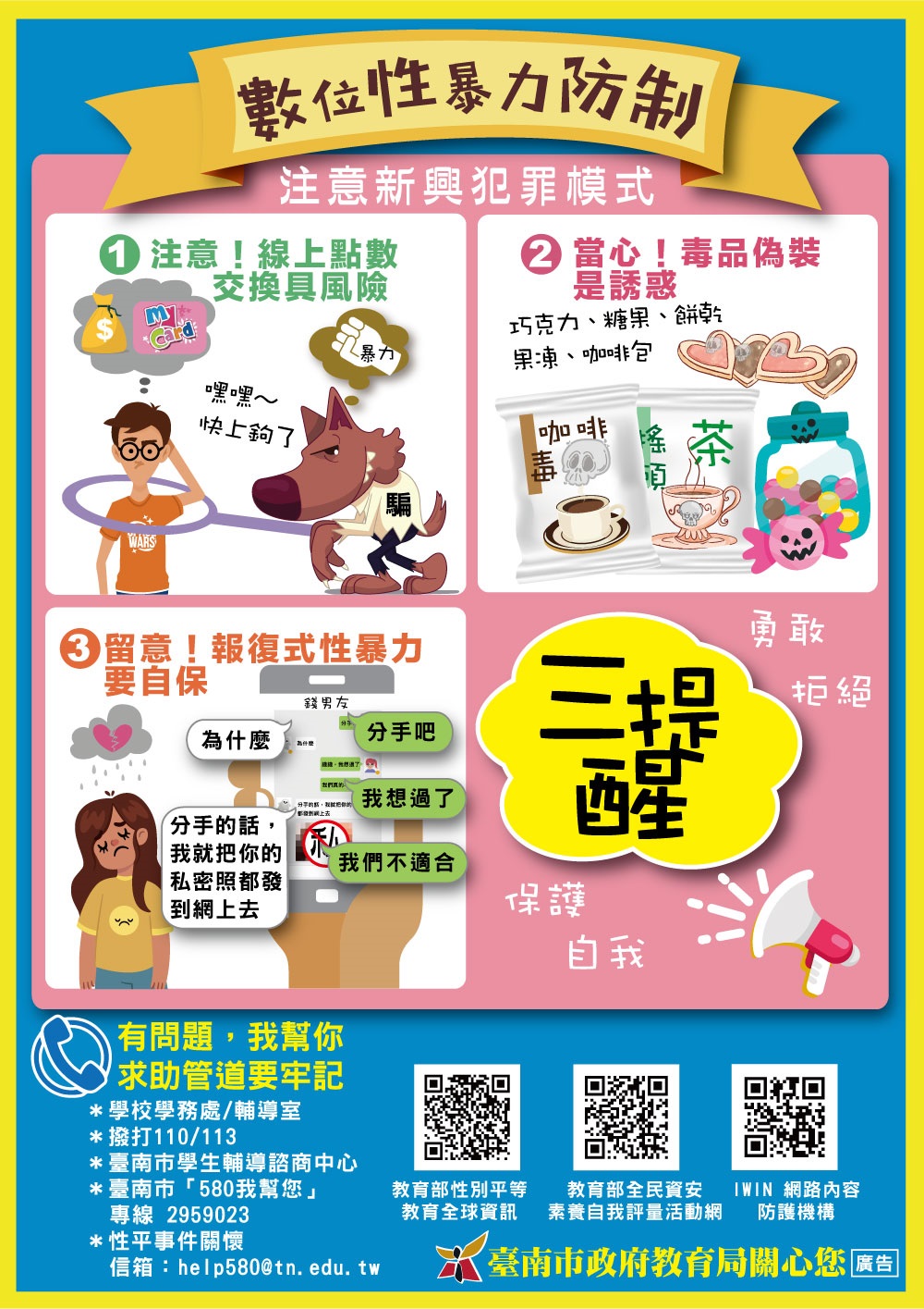 台南市教育局為宣導數位性暴力防制,製作圖卡供學校使用,敬請 適時宣導學生自我保護,請查照。