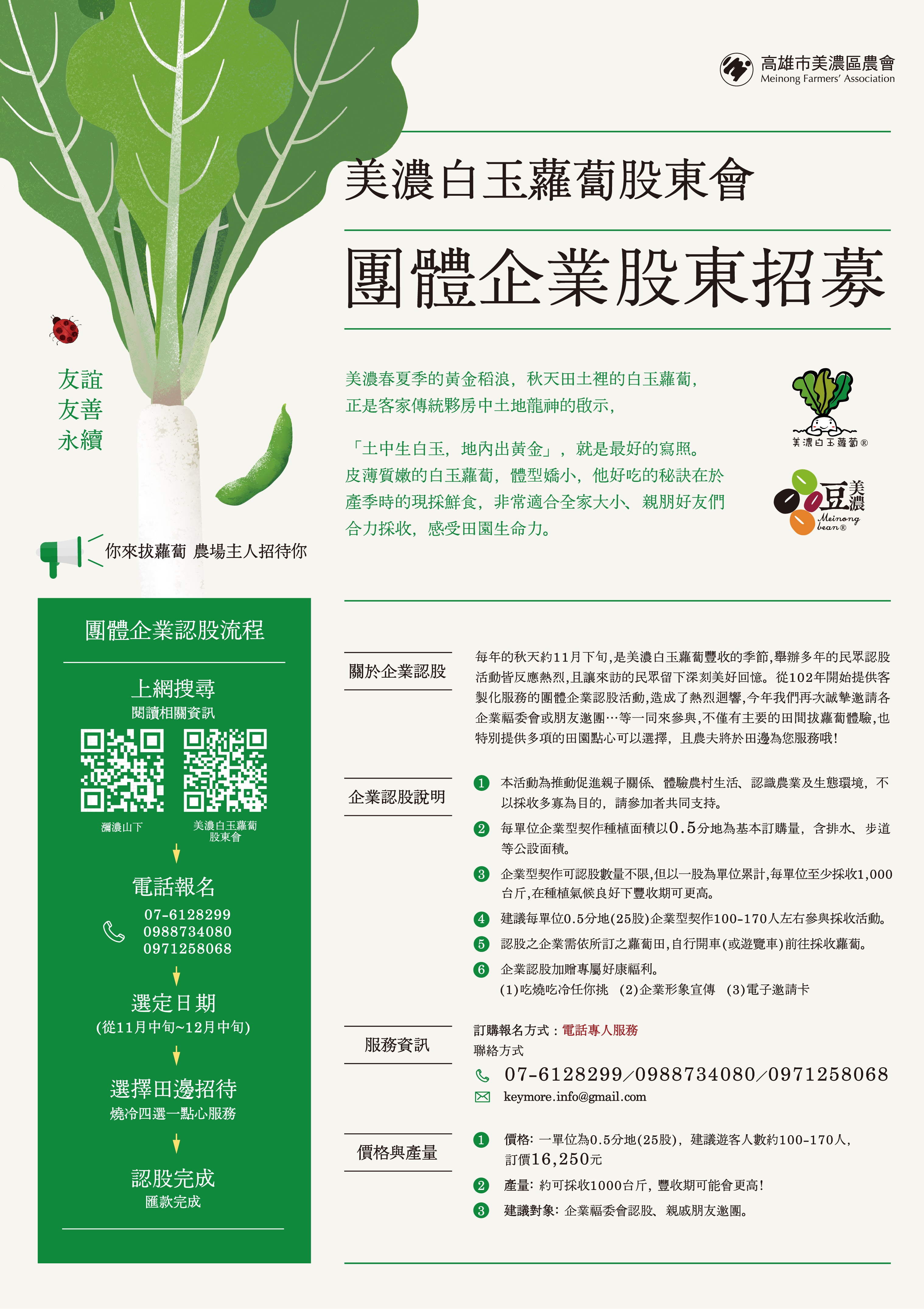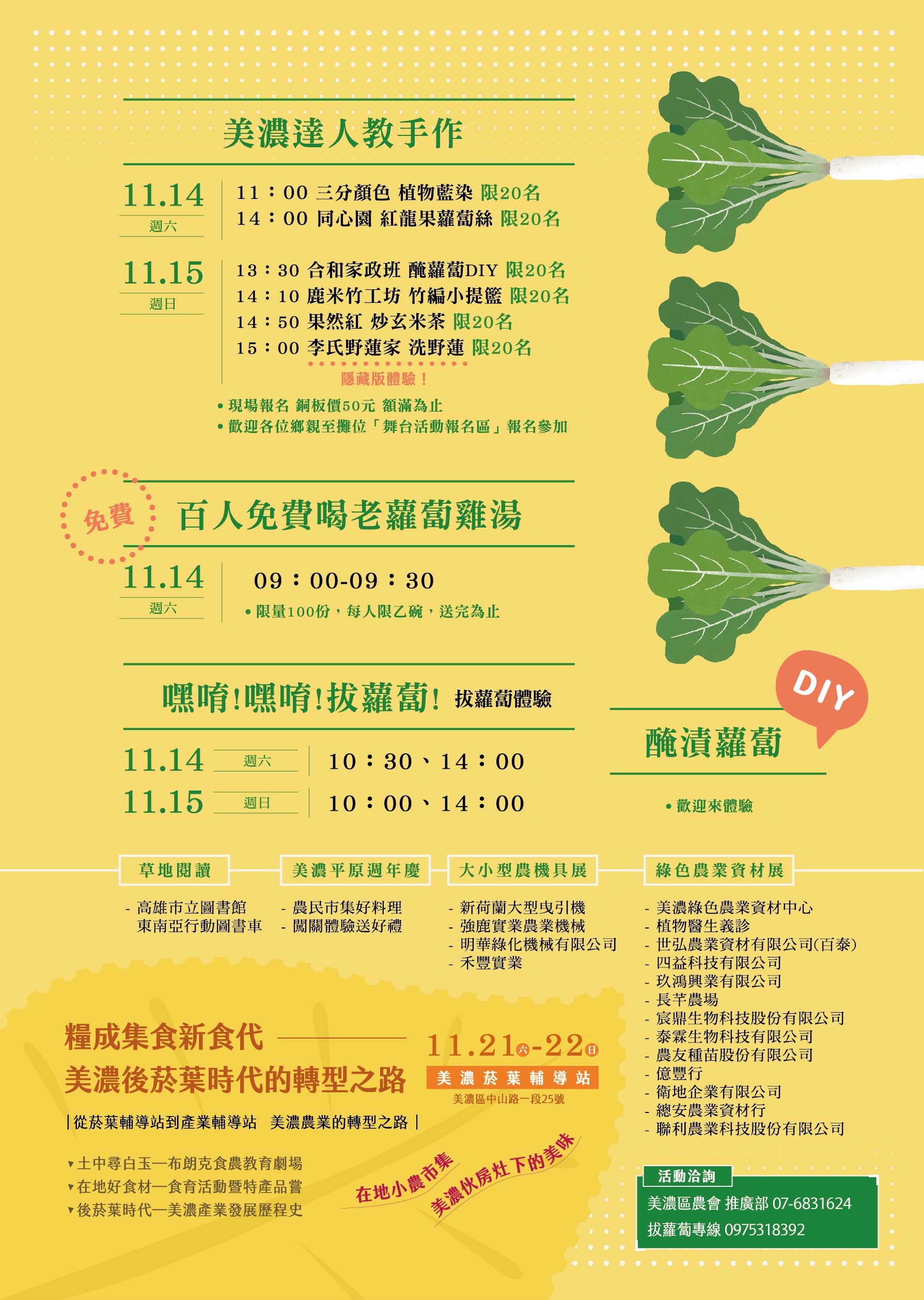 美濃區農會於11月14、15日(星期六、日)假美濃客家文物館前廣 場(地址:高雄市美濃區民族路43之3號)舉辦「2020美濃白 玉蘿蔔還有好豆季」活動,檢附活動內容乙份,歡迎各界 蒞臨共襄盛舉,請 查照。