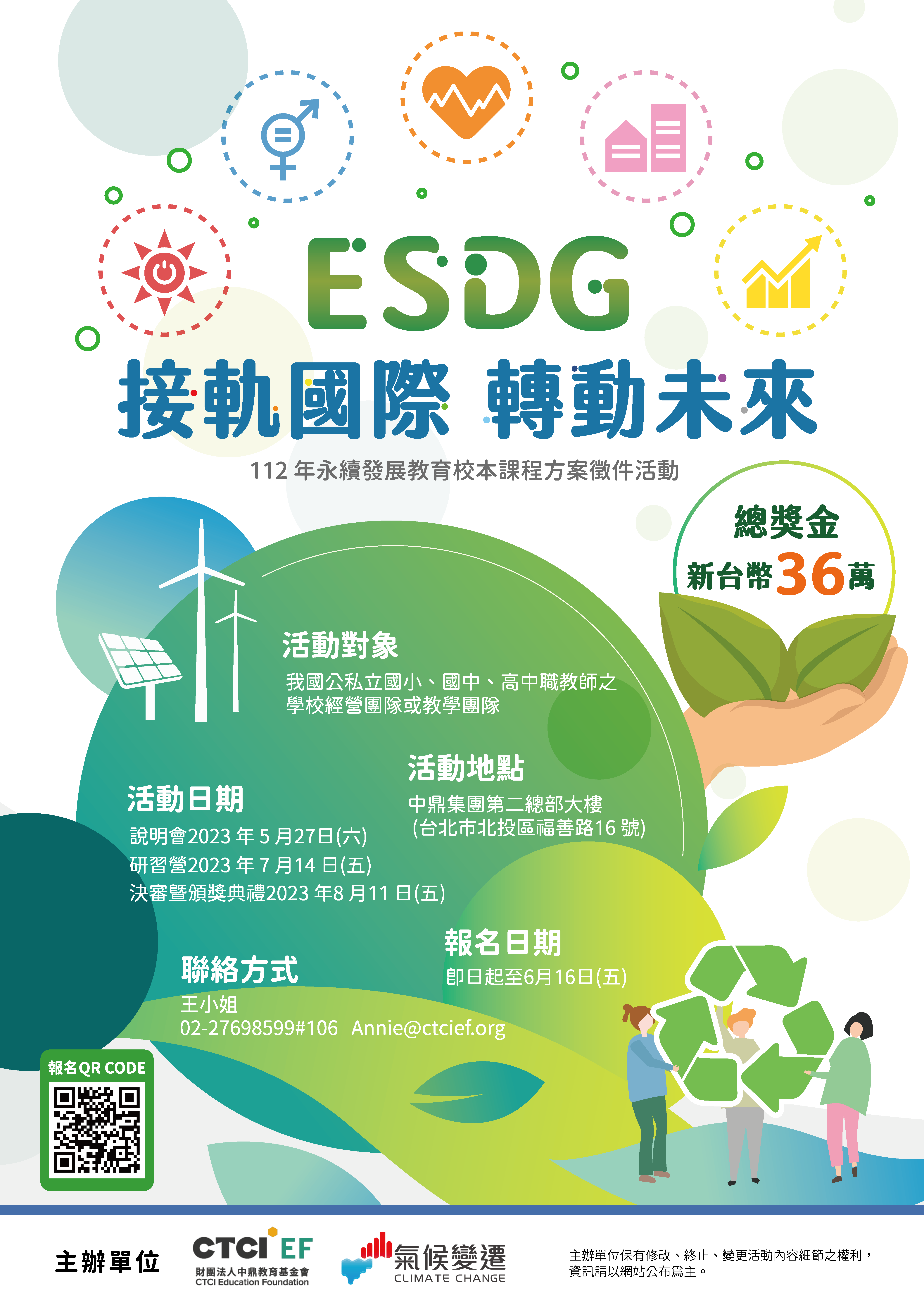 ESD+SDG=ESDG ,以此思維與框架設計校本位課程,接軌國際趨勢,發揮學校特色,並將 SDGs 融入校本課程,呼應全球與在地關鍵永續發展議題,提昇全校師生之永續發展素養。中鼎教育基金會(CTCI EF)與教育部氣候變遷教育計畫共同籌辦「ESDG 接軌國際、轉動未來-112 年永續發展教育校本課程方案徵件活動」。