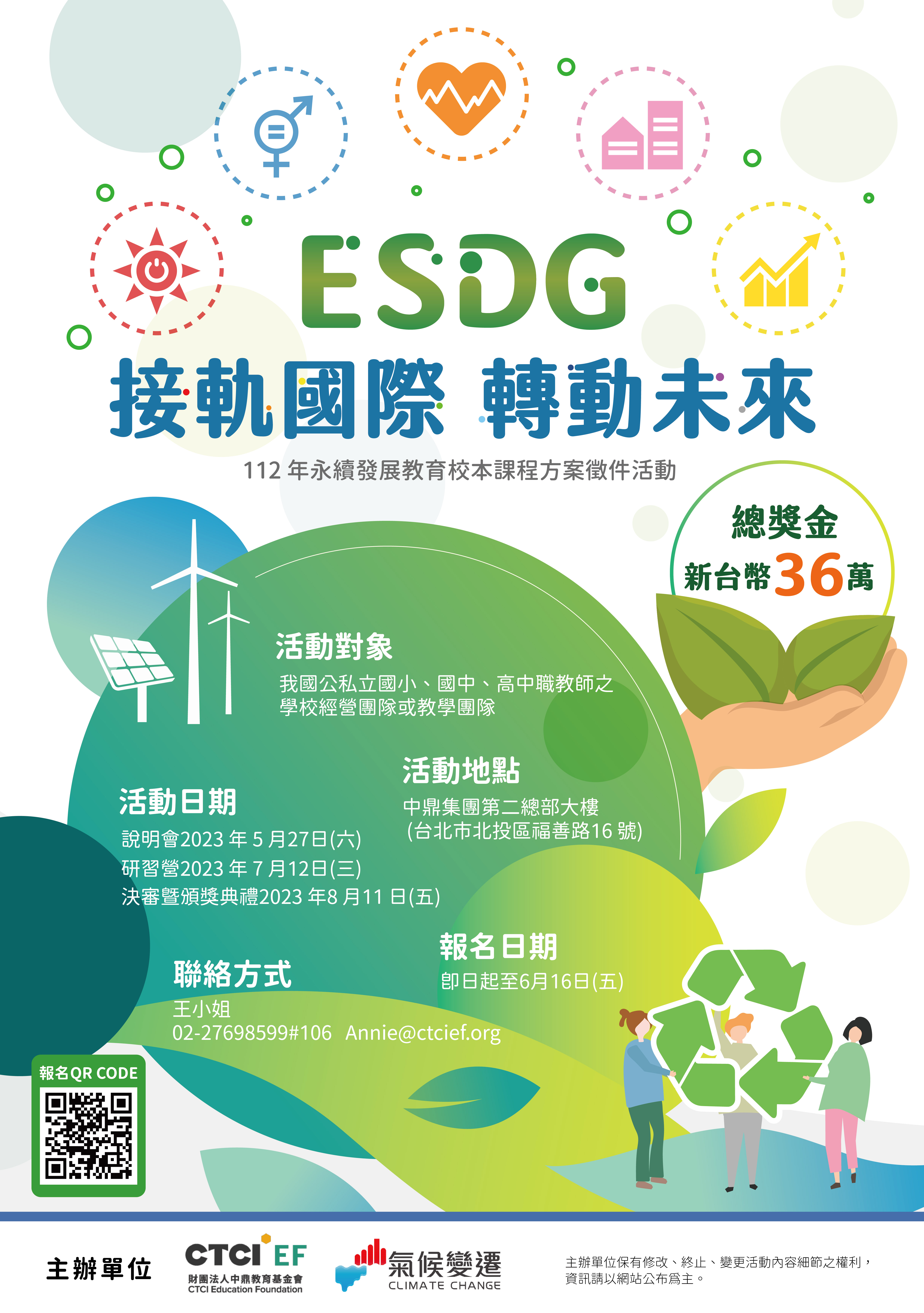 一、強化我國教育人員對於永續發展教育(ESD)與聯合國永續發 展目標(SDGs)的認識,並了解國際上正在發生的新趨勢: ESD+SDG=ESDG ,以此思維與框架設計校本位課程,接軌國 際趨勢,發揮學校特色,並將 SDGs 融入校本課程,呼應全 球與在地關鍵永續發展議題,提昇全校師生之永續發展素 養。中鼎教育基金會(CTCI EF)與教育部氣候變遷教育計畫 共同籌辦「ESDG 接軌國際、轉動未來-112 年永續發展教育 校本課程方案徵件活動」。