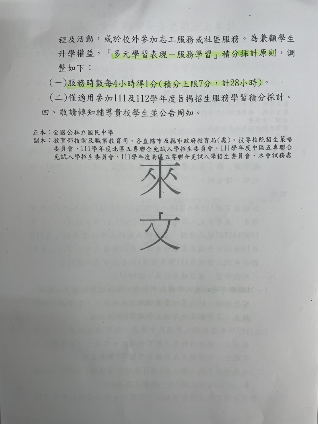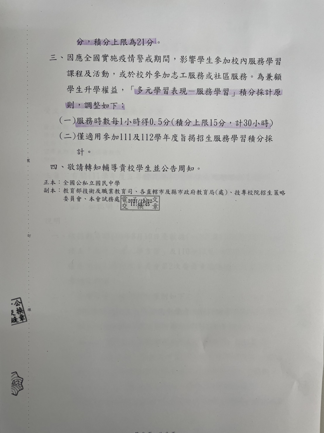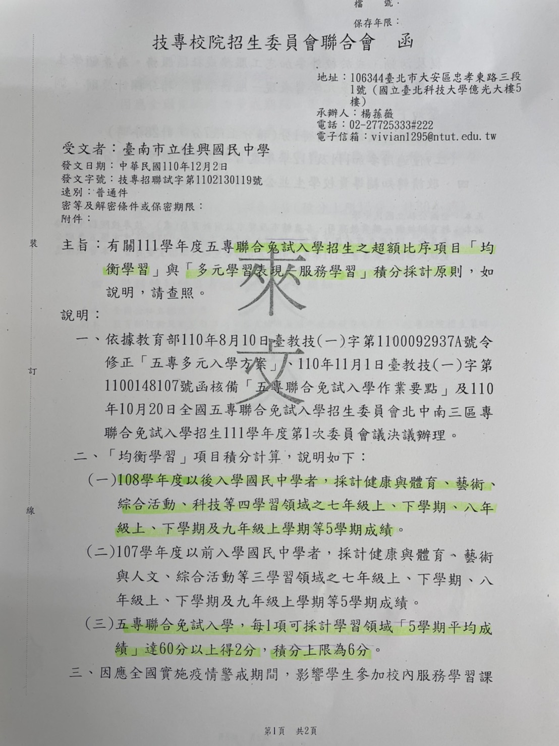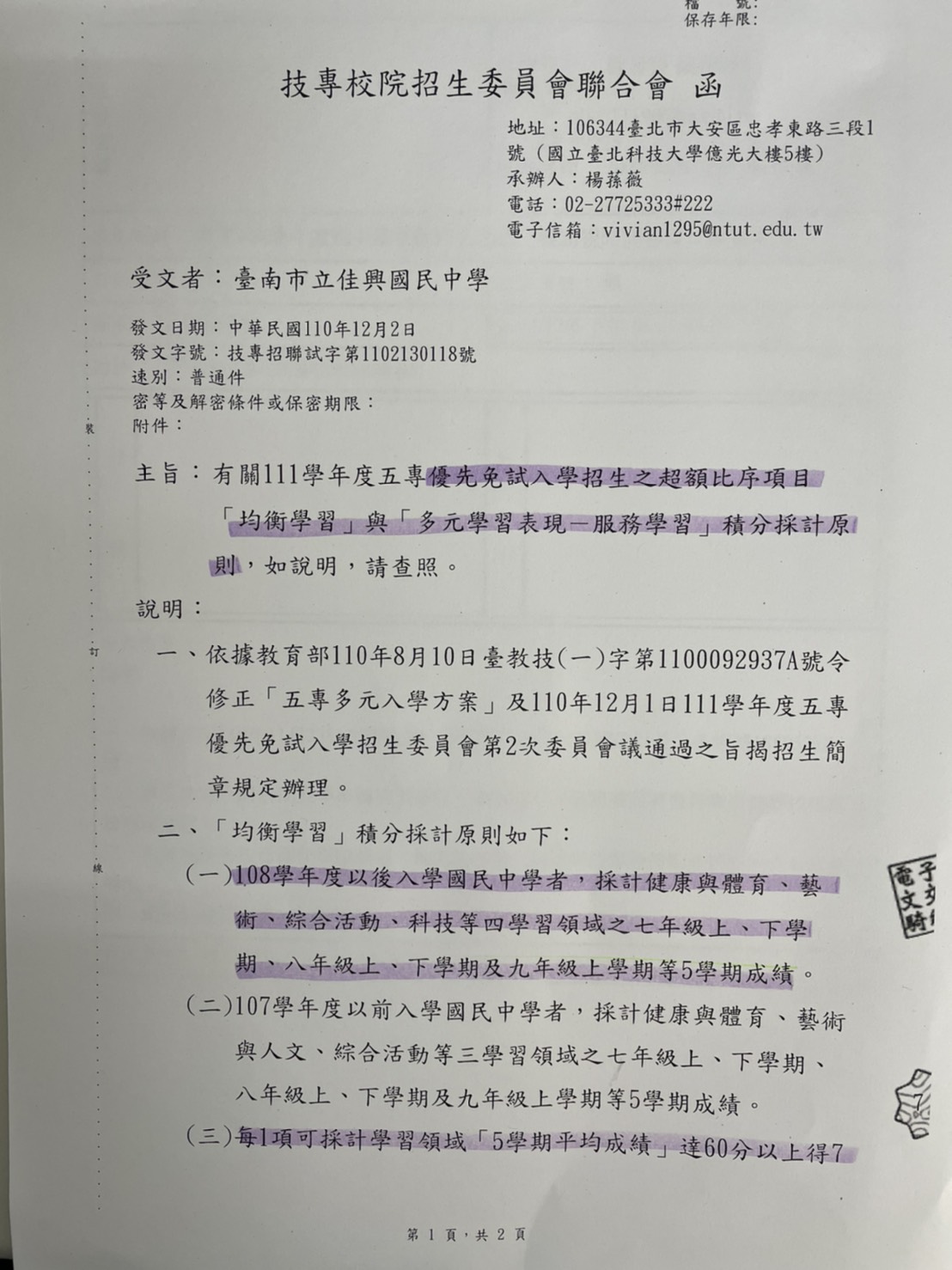 111學年度五專聯合免試及五專優先免試入學之超額比序項目採記原則