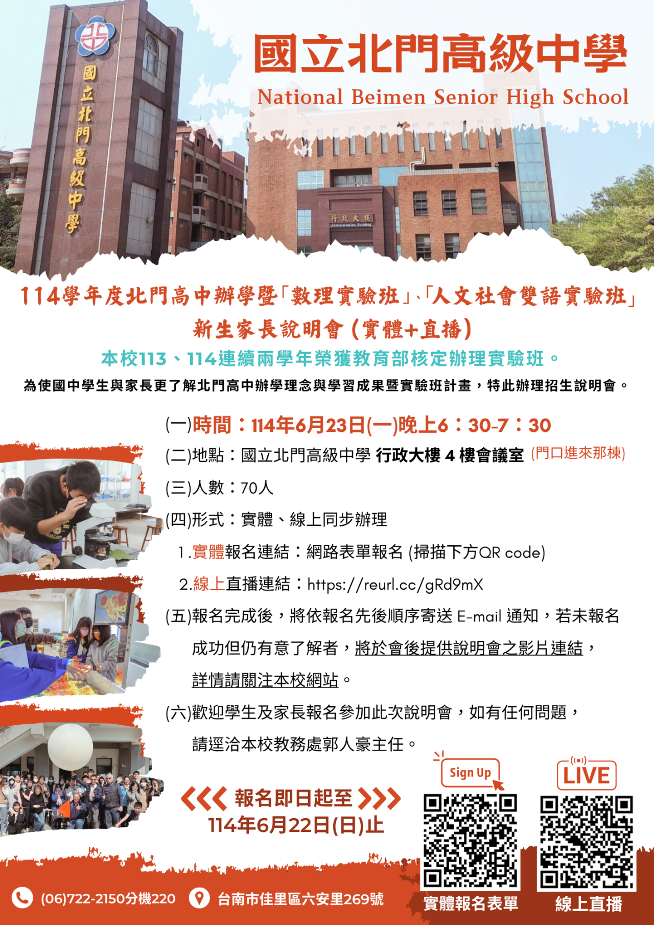 「國立北門高中114學年度數理及人文實驗班說明會」相關資訊