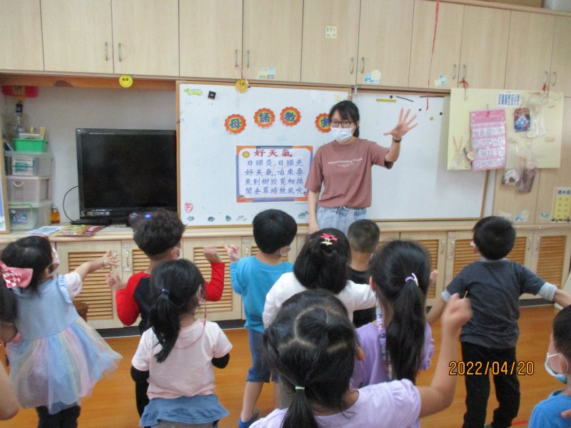 以故事引起動機,學習天氣相關臺語念法,教唱台語童謠~好天氣.進行律動.