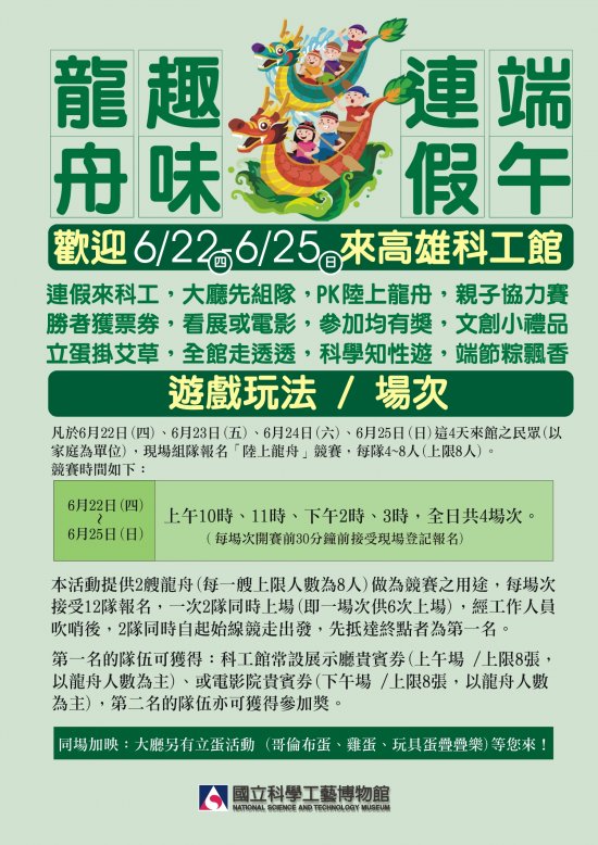 主旨:本館訂於本(112)年 6 月 22 日(週四)至 6 月 25 日(週日)端午節連續假期期間辦理「科工陸上龍舟趣味競賽」活動,敬請轉知貴校師生及家長,並鼓勵家長攜幼來館踴躍參與,請查照。