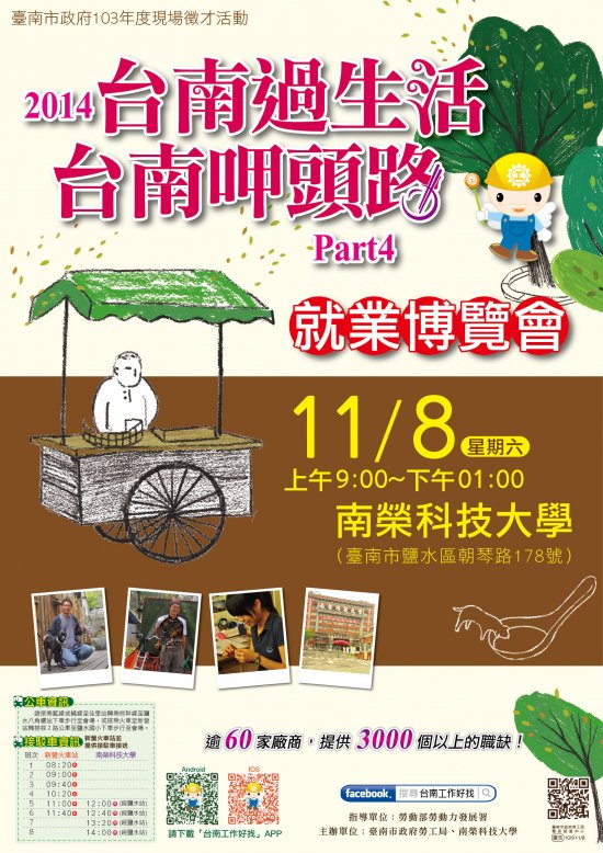 2014「台南過生活 台南呷頭路」Part4 就業博覽會, 11月 8 日(六)早上 9 點就在南榮科大,超過 60 家廠商,提供逾 3000 個職缺,當天並推出「七喜求職大好康」多項貼心服務:投遞 2 家履歷免費送「武廟紀念鑰匙圈」、「點心城冬瓜茶」、筆記本等多樣好禮,投遞 3 家以上就送您鹽水意麵、老店麻油或公仔布偶 2 選 1 ,當天還有接駁車免費接送服務,活動現場還有履歷健檢及就業諮詢、彩妝剪髮、按摩體驗、臺南市政府微電影大賞等多元就業服務,歡迎參加,詳洽: 06-6330820 。