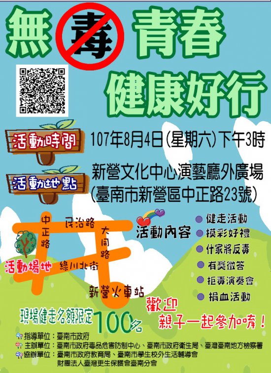 主旨:轉知臺南市政府謹定於 107 年 8 月 4 日(星期六)辦理 107 年「無毒青春,健康好行」反毒宣導活動,請協助將活動海報電子檔公告於所屬網站、臉書等電子媒體,並鼓勵所屬踴躍參加。