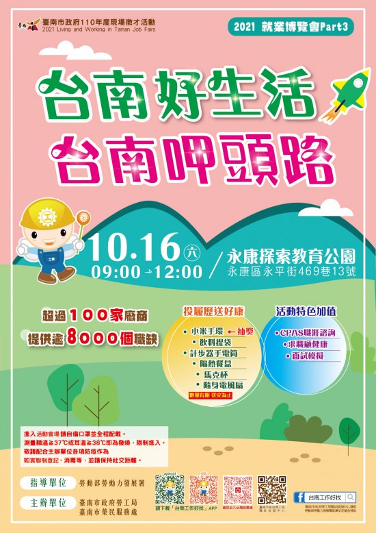 一、本中心將於 110 年 10 月 16 日(週六)假永康區探索教育公園辦理 2021「台南好生活 台南呷頭路」Part3 就業博覽會活動,惠請貴單位依下列自有管道協助宣傳(若無該管道則免),以利求職民眾知悉。