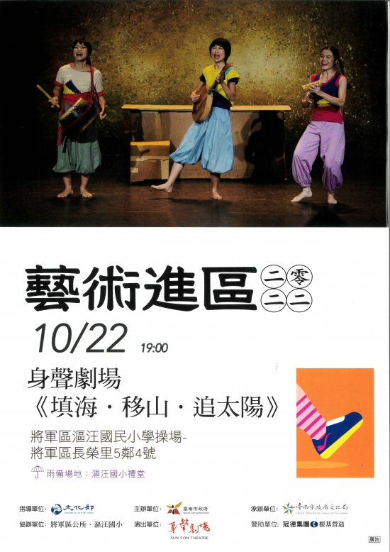 主旨:臺南市政府文化局策劃之「2022 藝術進區」活動訂於 111 年 10 月 22 日(星期六),假本區漚汪國民小學操場辦理,敬邀蒞臨觀賞並請協助宣傳,請查照。