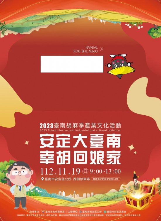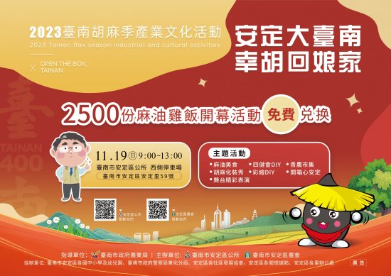 主旨:檢送本所辦理「2023 臺南胡麻季產業文化活動-安定大臺南 幸胡回娘家」活動宣傳海報電子檔 1 份,惠請貴單位協助公告宣傳及網站連結,竭誠歡迎蒞臨指導,至紉公誼,請查照。 說明: 一、活動時間: 112 年 11 月 19 日上午 9 時至下午 1 時 二、活動地點:本所西側停車場(臺南市安定區安定里 59 號) 三、相關活動訊息請至本所網站(https://web.tainan.gov.tw/anding/),亦可於臉書搜尋「安定區公所」查詢或洽詢本所農業及建設課王先生。