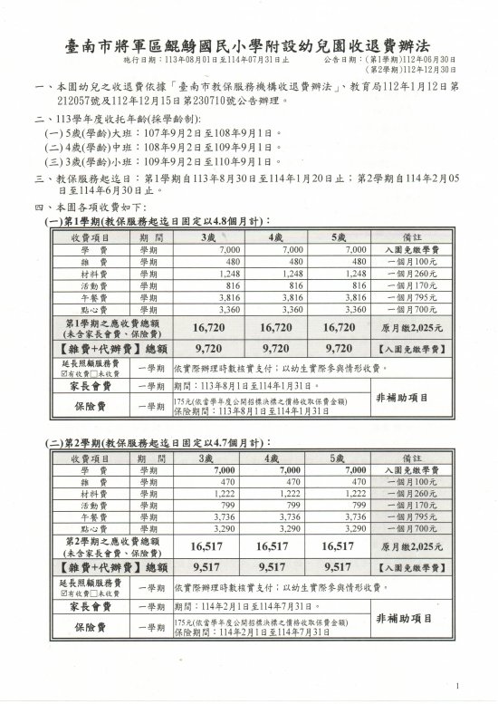 113學年度收費辦法
