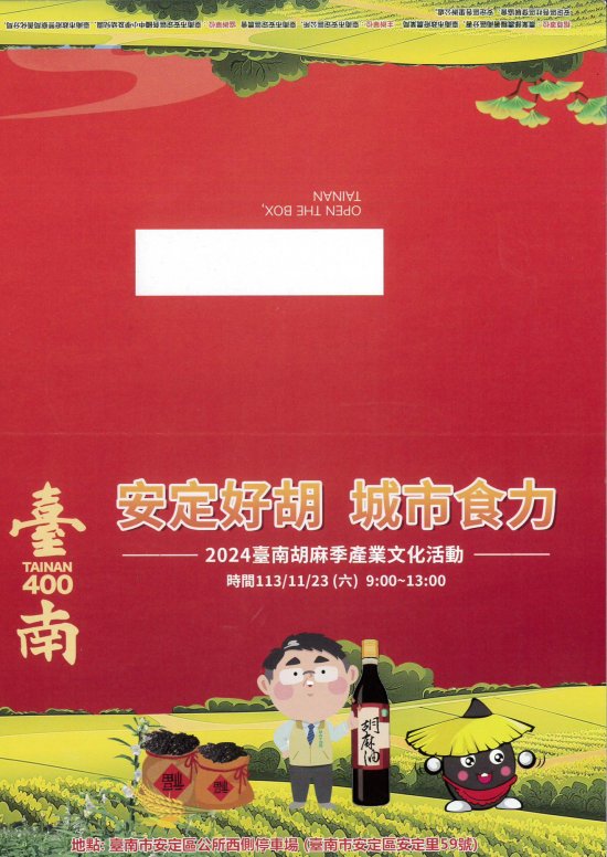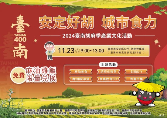 主旨:檢送本所辦理「2024 臺南胡麻季產業文化活動- 臺南 400 安定好胡 」活動宣傳海報電子檔一份,惠請貴單位協助公告宣傳網站連結及使用跑馬燈,竭誠歡迎蒞臨指導,至紉公誼,請查照。