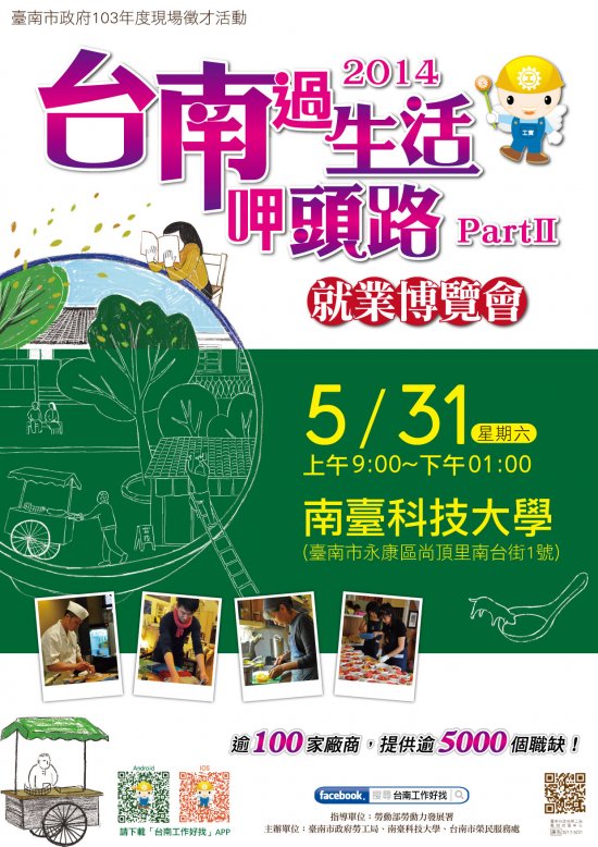 2014「台南過生活 台南呷頭路」Part2 就業博覽會於 5 月 31 日星期六上午 9 時,就在南臺科技大學三連堂,現場有 100 多家廠商提供超過 5 千個工作機會,詳洽 6330820 。