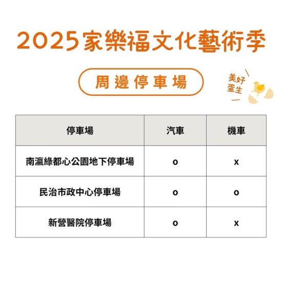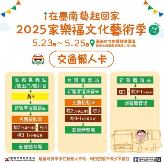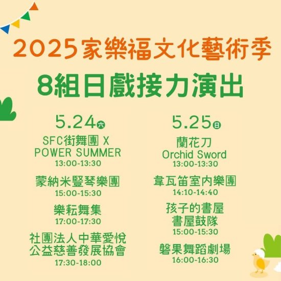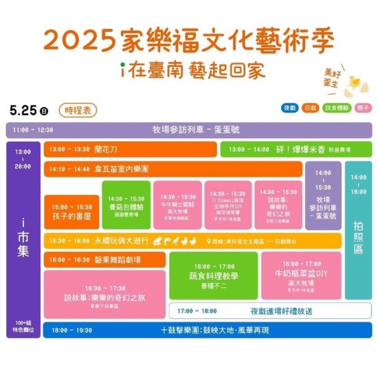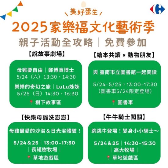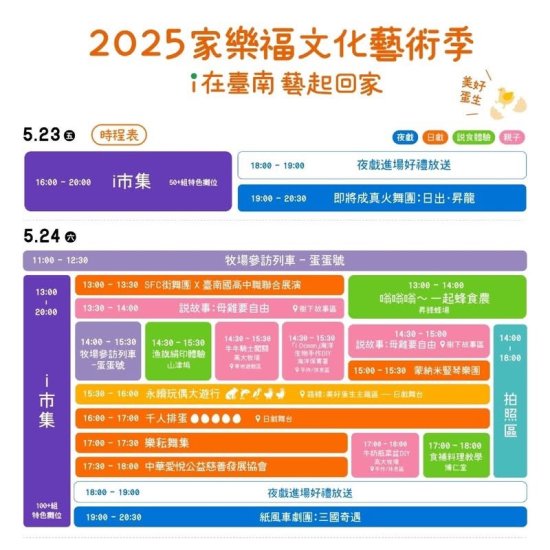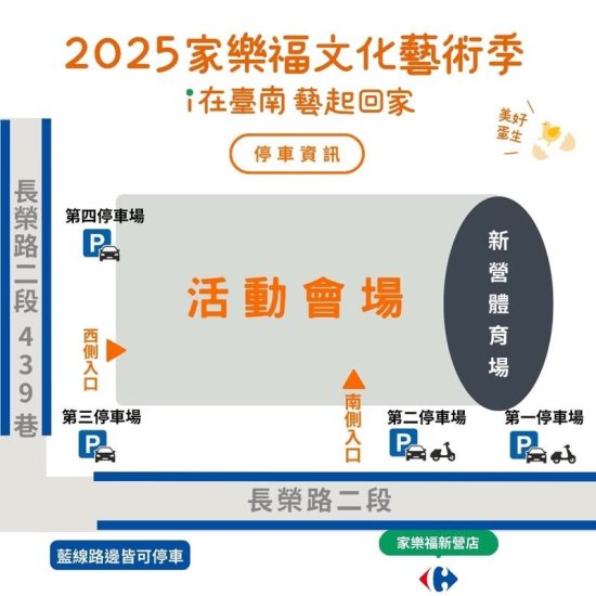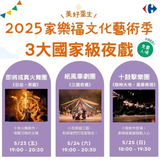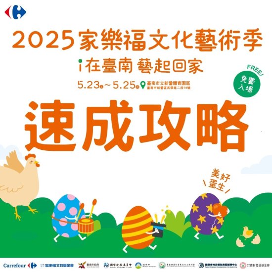 一、本局與財團法人家樂福文教基金會將於 114 年 5 月 23 日(五)至 5 月 25 日(日)於臺南市立新營體育園區舉辦 2025 家樂福文化藝術季,有日戲、夜戲演出與市集,全程免費入場,邀請共襄盛舉。