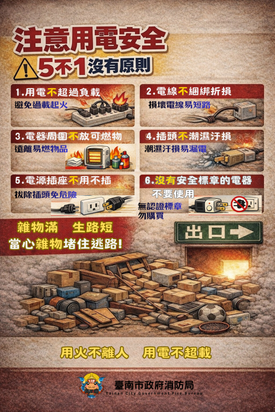 (一)防範電氣火災記得五「不」一「沒有」:用電不過載、電線不綑綁、插頭不污損、插頭不用不插、周圍不放可燃物,沒有安全標章的電器不買不用。