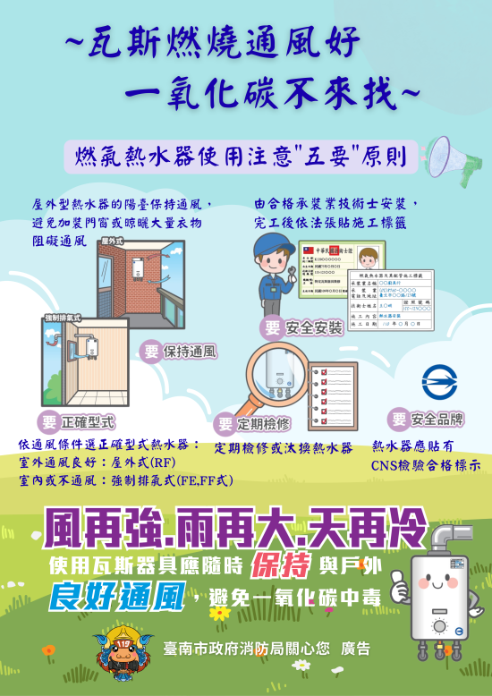 (二)防範一氧化碳中毒:使用瓦斯熱水器及瓦斯爐時 ,通風安全要注意。