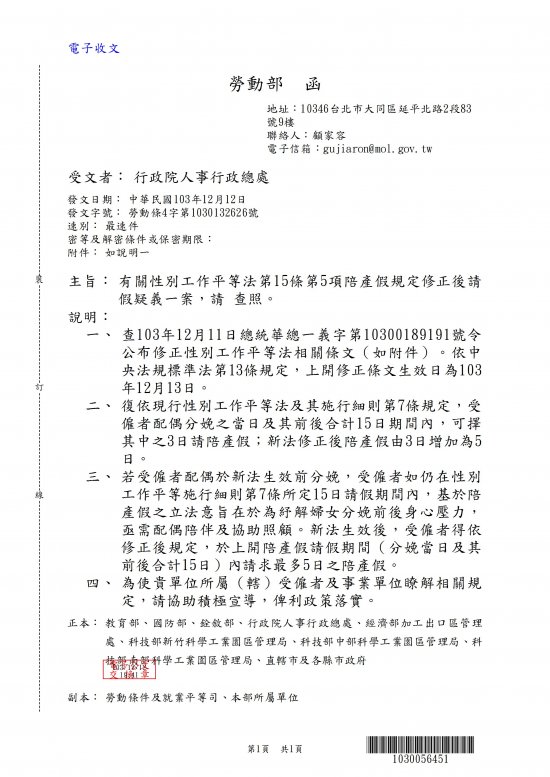 主旨:有關性別工作平等法第 15 條第 5 項陪產假規定修正後請假疑義一案,請 查照。