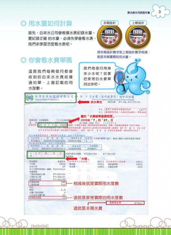有關愛水節水月家庭作業: 若有家長沒有留水費單的習慣,可以打電話至自來水公司佳里服務所,用登錄的地址或電話查詢水號,佳里服務所電話:(06)7222477 。