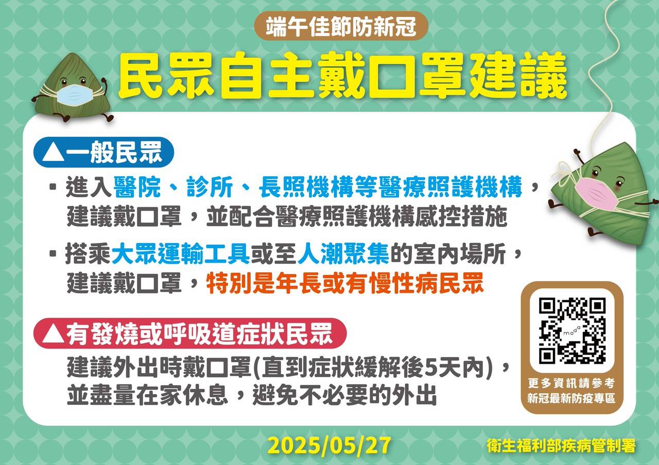 一、端午連假將至,國人出遊、聚會增多,病毒更容易傳播,呼籲民眾放假不忘防疫,外出自主戴口罩,做好防疫措施: