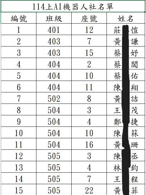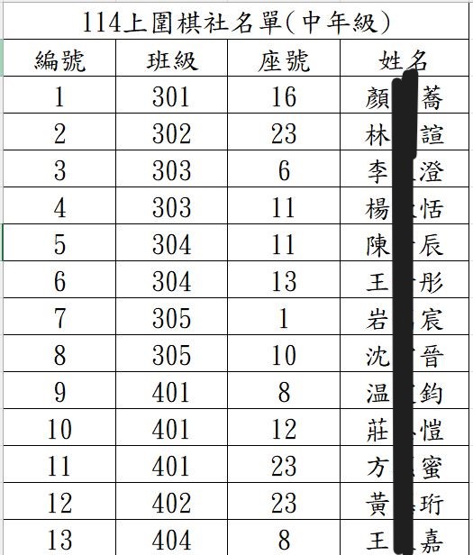 114學年度上學期圍棋社及AI機器人社錄取名單。