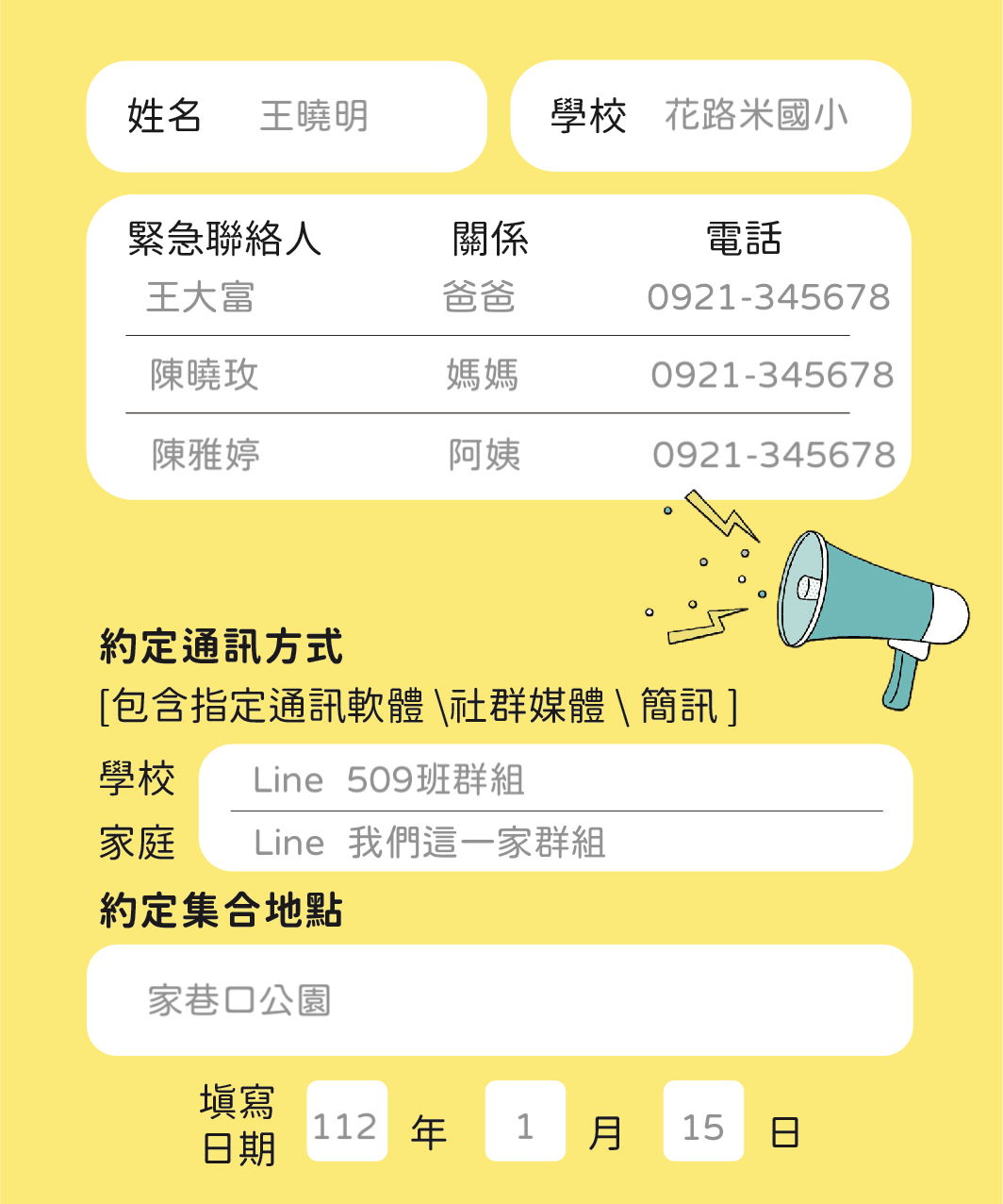 (二)家庭欄位:學生本人在災害發生時聯繫家長之約定通訊方式,如網路暢通時,可採用通訊軟體;如網路不暢通時,可採簡訊等方式聯繫。