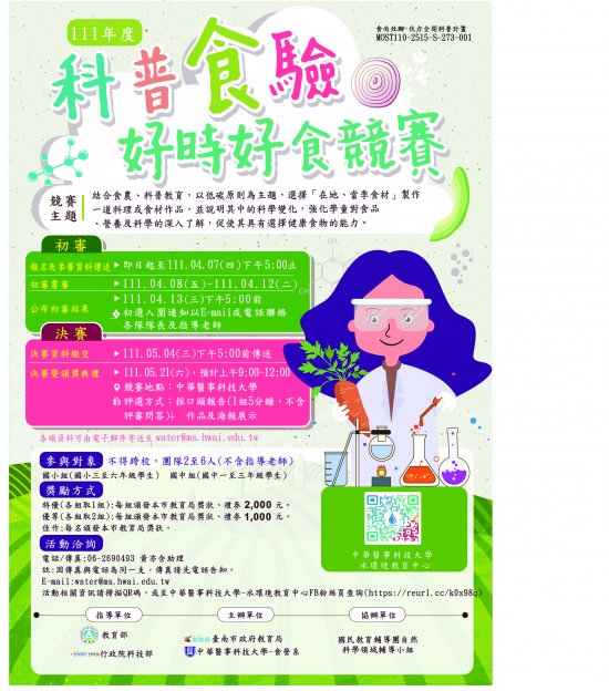 四、本案聯絡人:中華醫事科技大學水環境教育中心黃助理,電話: 06-2690493 , Email : water@ms.hwai.edu.tw 。
