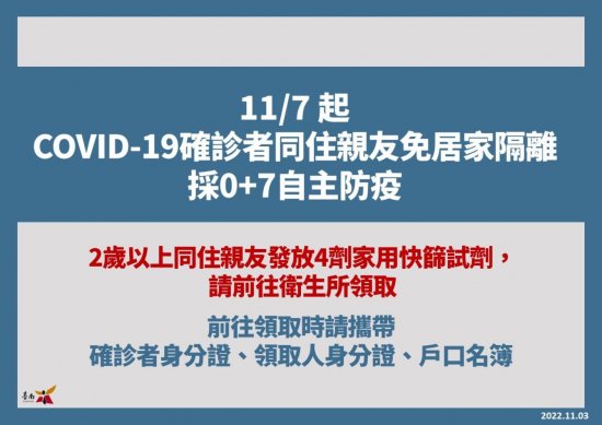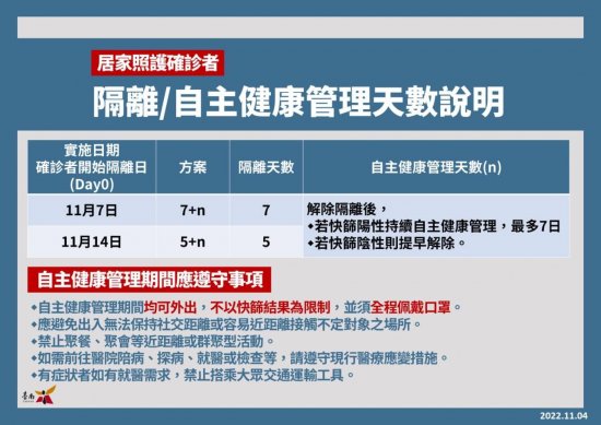 4. 11/14 起確診者隔離/自主健康管理天數為 5+n ,需居家隔離 5 天,n 為自主健康管理天數,確診日(第 0 天)後,第 6 天起快篩陰性可解除自主健康管理或自主健康管理 7 天後解除。