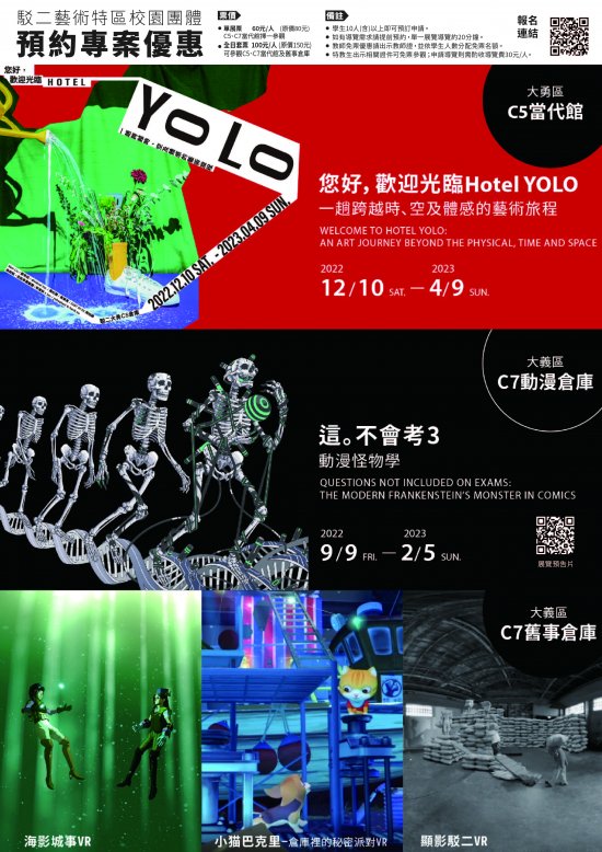 (一)駁二當代館「您好,歡迎光臨 Hotel YOLO」: 當代藝術類特展(即日起至 2023 年 4 月 9 日),以旅館作為闡述展覽的載體,將空間分成 3 大區域規劃,接待大廳、小酒館及客房, 9 位藝術家作品分別帶出「相遇、時間與空間、存在與缺席、科技、生命及人生態度」等議題的討論,透過遊走觀賞的體驗過程,得以在旅途過程中找回被遺忘已久的身體感受。