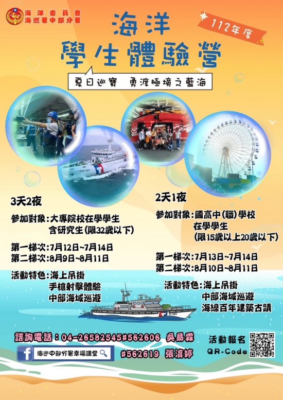 二、為培養青年學子對於海洋之情感與知識,提供暑期休閒育樂活動,爰訂於 7 月至 8 月期間舉辦旨述活動,相關資訊詳如活動簡章。