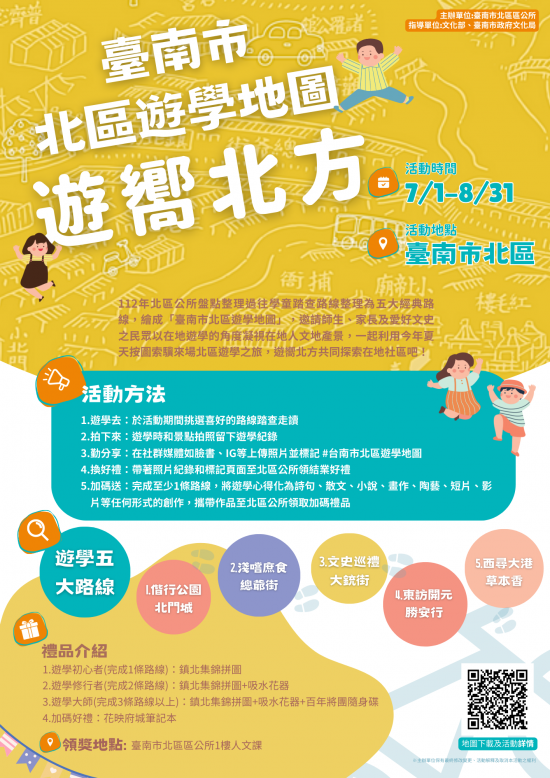 一、本所自 106 年起辦理「學童踏查」計畫,邀請北區師生以在地遊學的角度凝視在地人文地產景,透過社區走讀、踏查、學習、紀錄、討論的過程,了解在地社區的特性、文化資產及在地內涵,累積學生公民素養及社區意識。承蒙各校多年響應, 112 年北區公所盤點過往各校踏查路線整理為五大經典路線,繪成「臺南市北區遊學地圖」,訂於 7 月 1 日至 8 月 31 日辦理旨揭活動,供師生、家長及愛好文史之民眾利用今年夏天按圖索驥來場北區遊學之旅,共同探索在地社區。