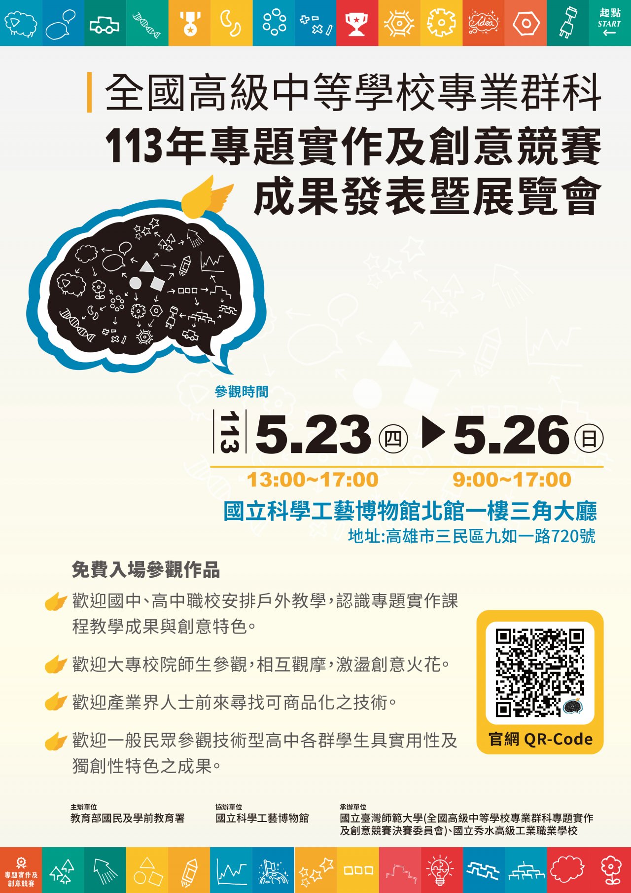 二、本展覽目的為「全國高級中等學校專業群科專題實作及創意競賽」(以下簡稱本競賽)依技術型高中 15 群科分成「專題組」與「創意組」兩組,經由學生之創意與實務作品展現技術型高中教學成果。本展覽邀請榮獲第一名之作品團隊展出,包含專題組 22 件作品及創意組 15 件作品,共 37 件優良作品參展,並由得獎學生現場解說。透過此次成果發表暨展覽會活動使社會大眾進一步瞭解技術型高中之群科內涵與務實致用特色。