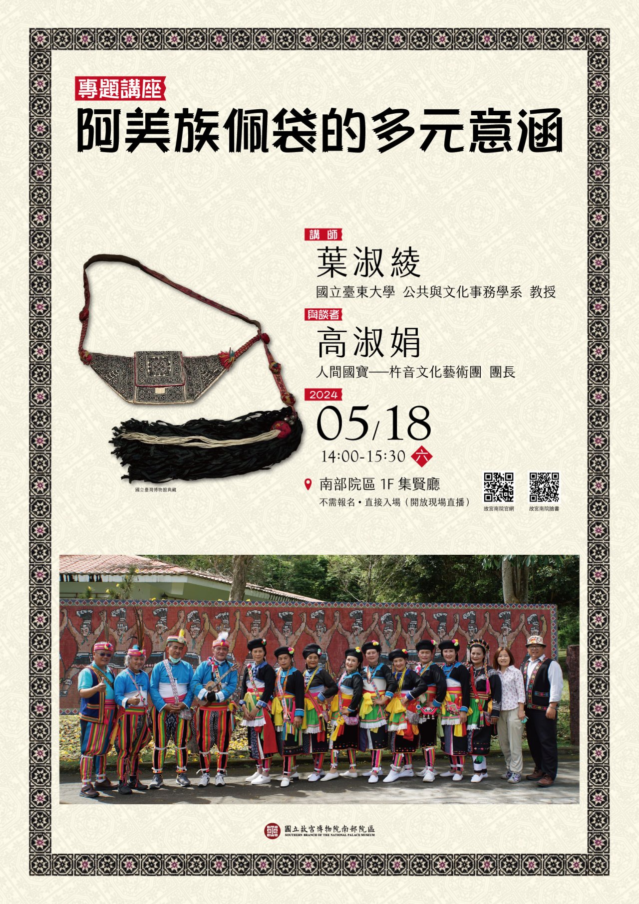 (四)內容:本次講座以阿美族佩袋「'alofo」為引,深入揭示其豐富的文化意涵,探討阿美族的行為體系、象徵網絡以及認同意識,以及探索文化持續與變遷的樣貌。