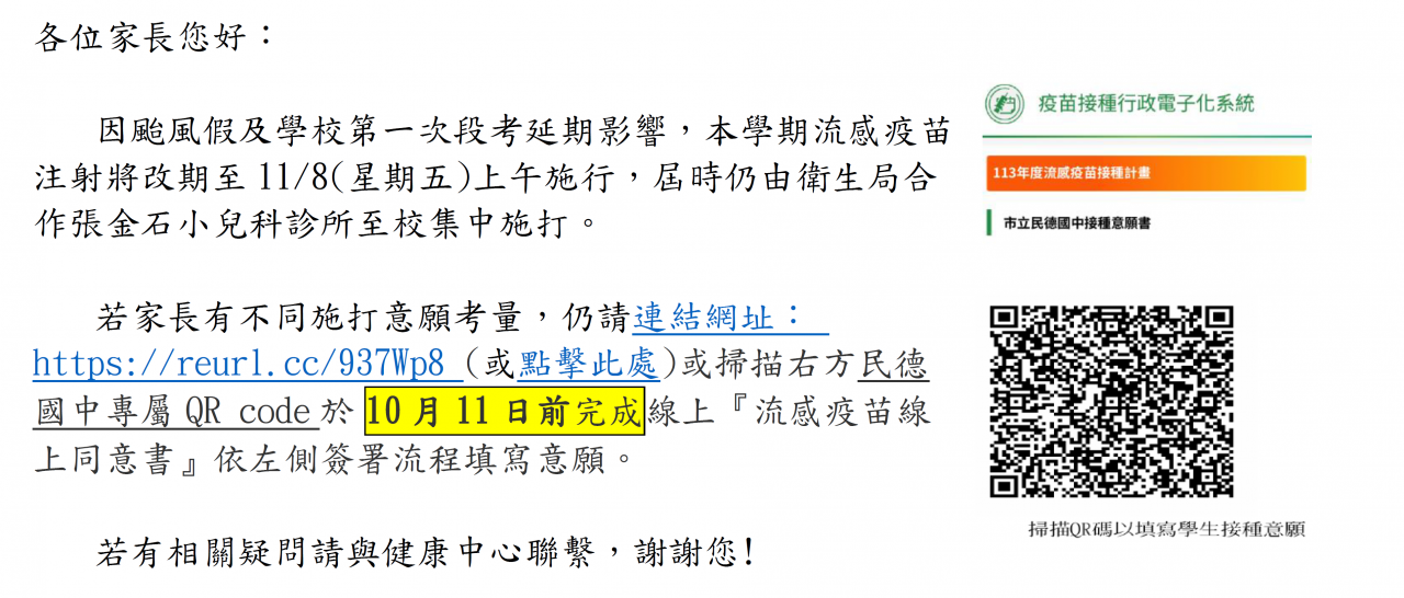 本校流感疫苗接種,因配合段考延期,調整至11311 月 8 日(五),由衛生局特約張金石診所入校接種若需修正意願,請於10月 11 日前完成線上『流感疫苗線上同意書』簽署,網址: https://reurl.cc/937Wp8或掃描附件中民德國中專屬 QR code,線上簽署說明如下: