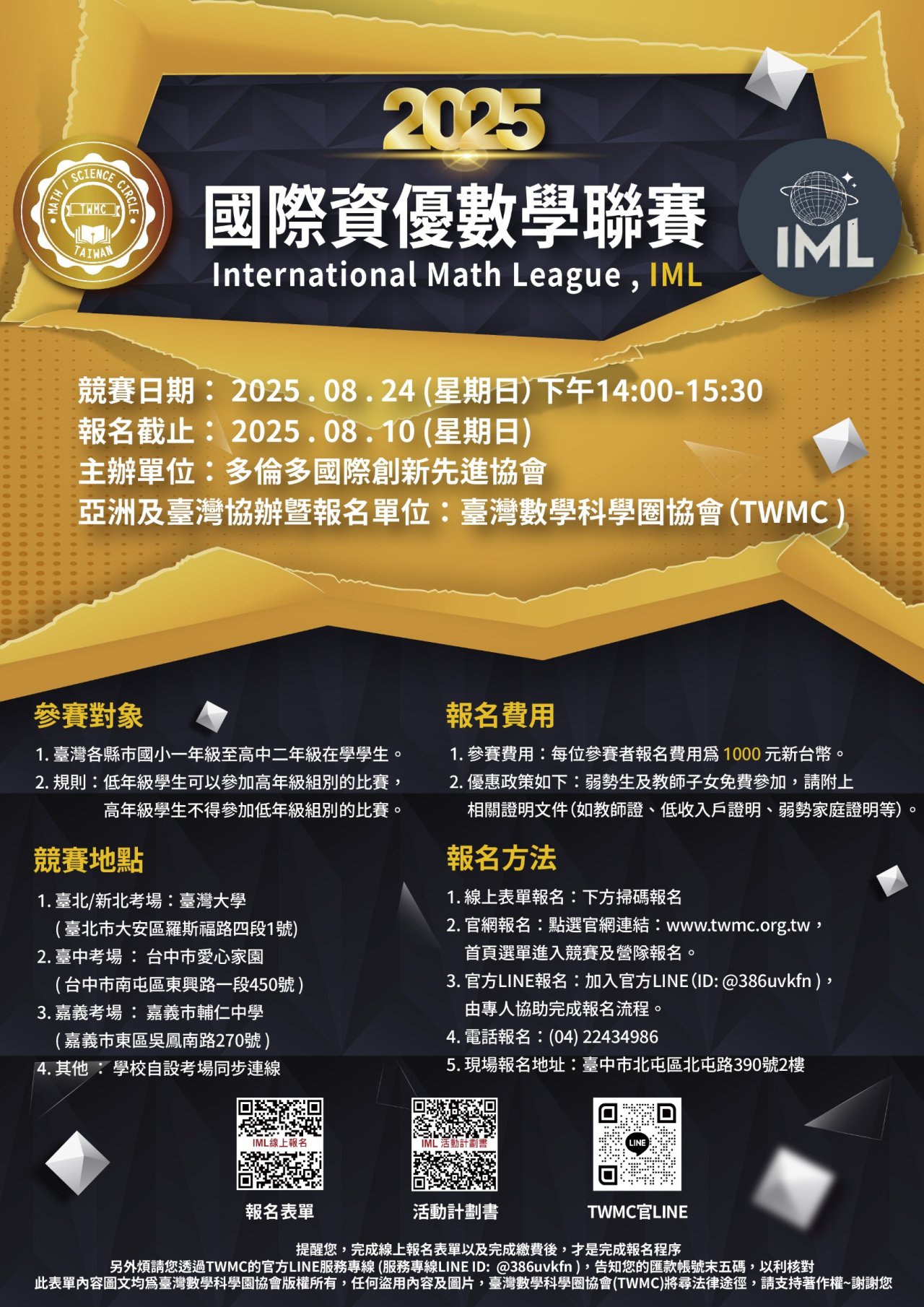 我們是臺灣數學科學圈協會( TWMC ),致力於推廣數學教育與公益活動。本會誠摯邀請貴校師生參與由我們協辦的「2025 國際資優數學聯賽( International Math League, IML )」。