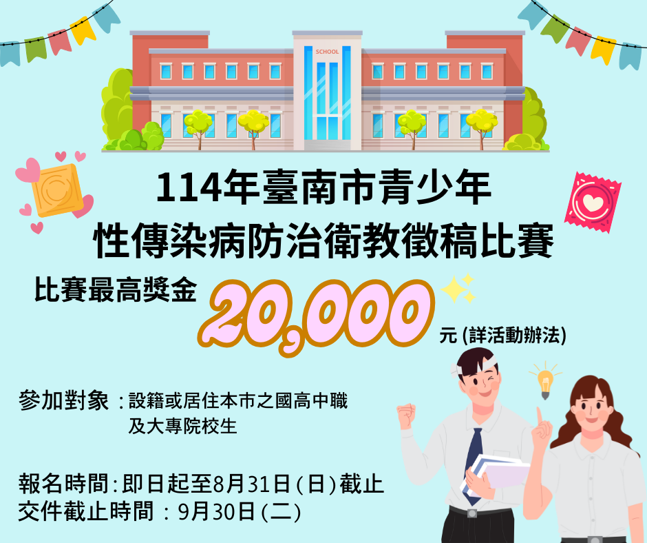 二、比賽目的為藉由本次比賽,徵求青少年性傳染病之衛教宣傳素材,以利後續針對學生族群加強性傳染病之防治,冀望透過宣導素材建立學生正確性傳染病防治觀念,以有效降低本市年輕族群性病之發生率。