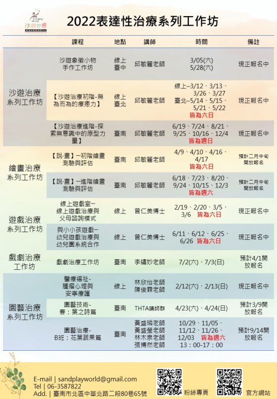 (三)沙遊治療進階:【臺南】6/19 、 7/24 、 8/21 、 9/25 、 10/16 、 12/4 ,皆為週日( 4/6 開放報名,報名期限至 6/10 )
