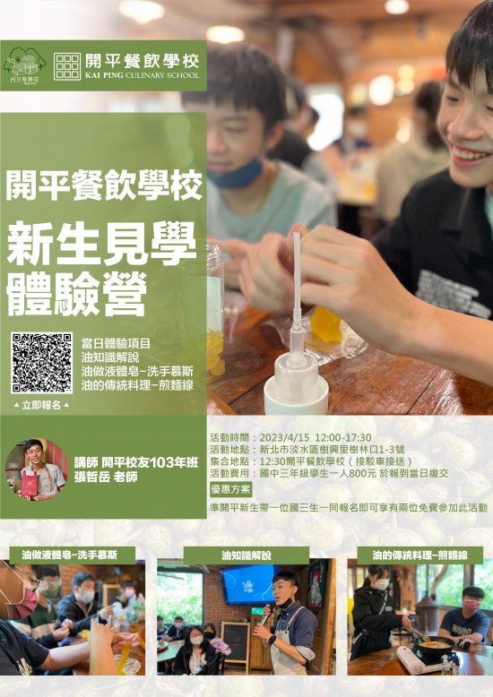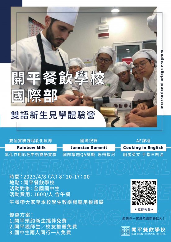 一、為協助對餐飲有興趣的國中生,透過有趣的專業實作,建立生涯想像,本校訂於 112 年 4 月 8 日(六)辦理「雙語新生見學體驗營 30 人」、 4 月 15 日(六)辦理「新生見學營體驗營 30 人」,歡迎有興趣的同學報名參加。