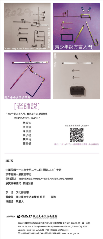 一、為推廣青少年體驗當代藝術創作,由本館規劃《老師說》,邀請當代藝術家林煌迪、蕭聖健、康立穎、蔡宗祐、葉子啟及陳信成帶來複合媒材、機械藝術、當代金工、當代繪畫及行為藝術等作品展出,呈現當代藝術的多元性。