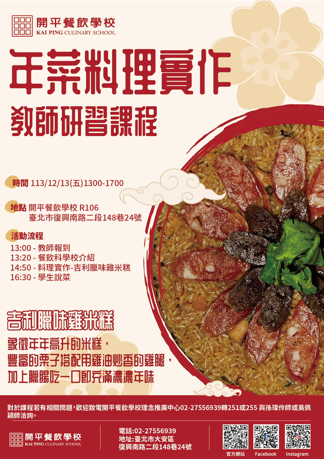 四、報名方式:採線上報名,請上”全國教師在職進修資訊網”報名,課程名稱:創意年菜教師研習,課程代碼: 4775177 。報名截止日期: 113 年 12 月 11 日(三),課程名單將於開課前二天確認遴選名單。