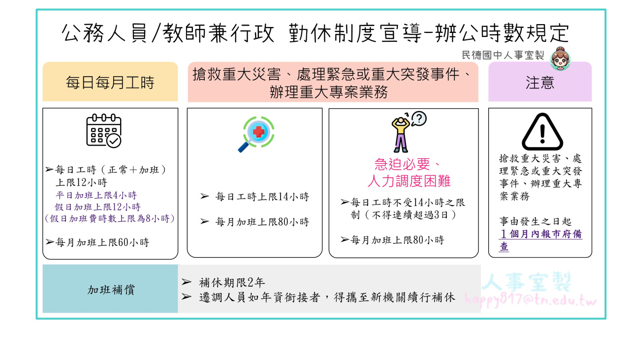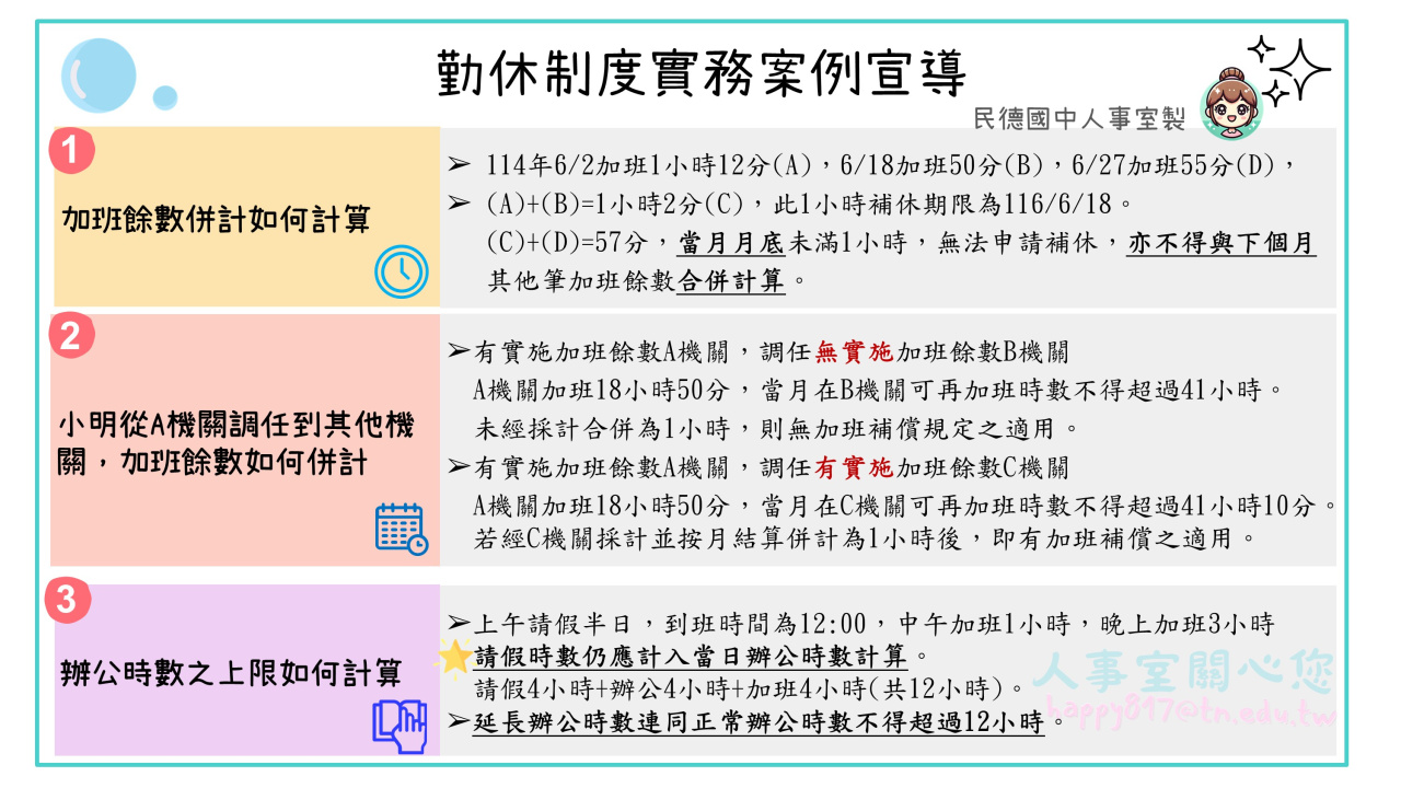 行政院人事行政總處製作「113 年行政院與所屬中央及地方各機關(構)公務員勤休制度宣導課程」並置於「e 等公務園+學習平臺」,課程連結https://elearn.hrd.gov.tw/info/10035962