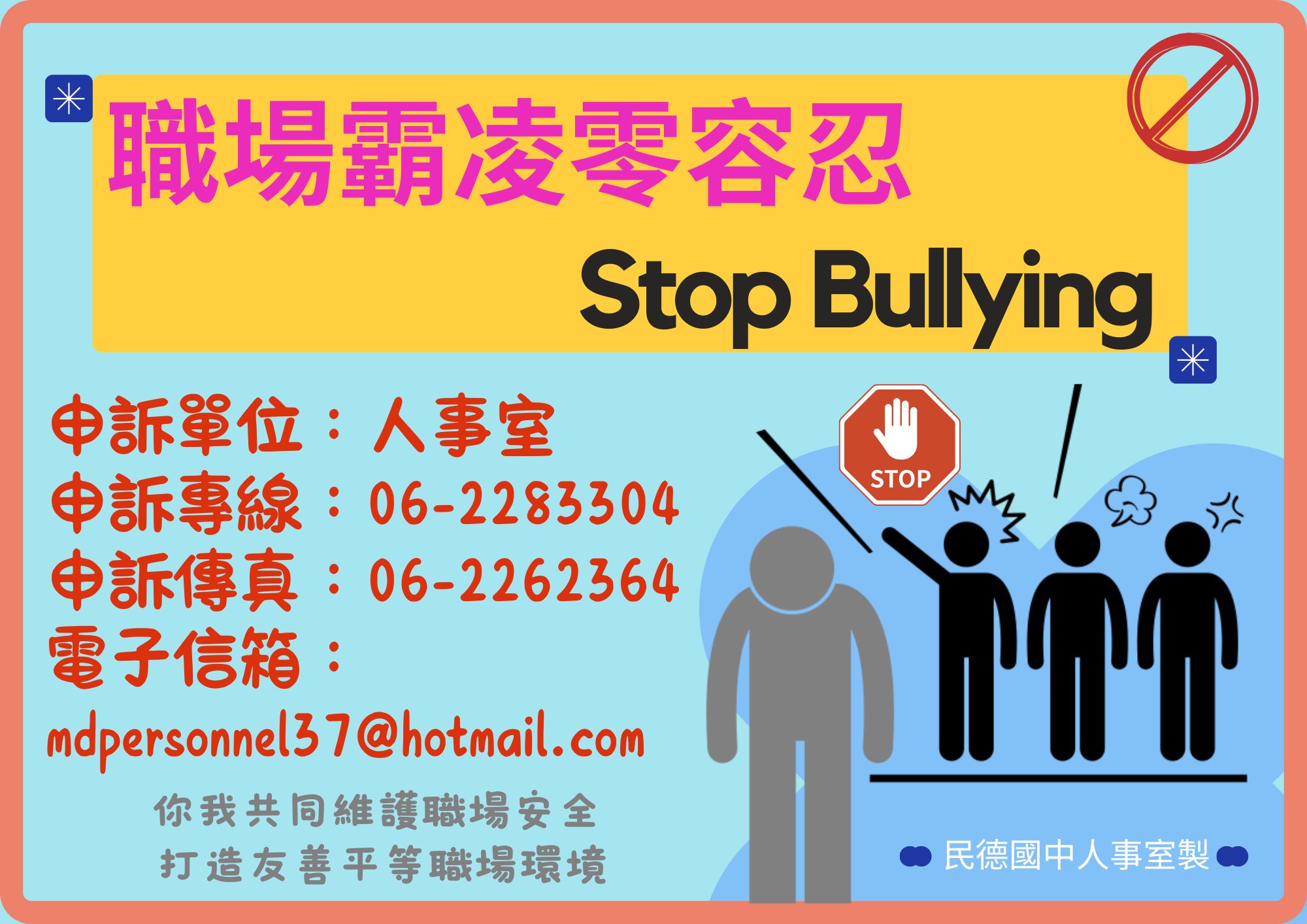 三、檢附臺南市政府及所屬各機關學校員工職場霸凌防治與申訴作業注意事項及本校人事室製作「職場霸凌零容忍」宣導圖卡。