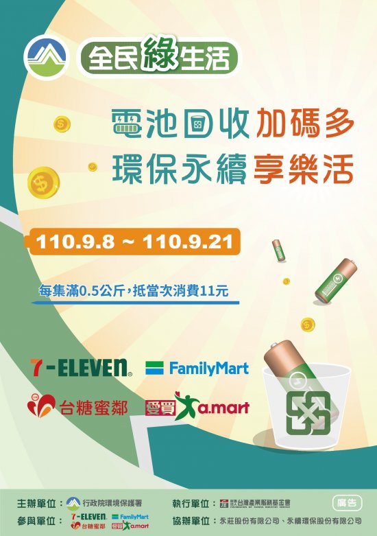 二、 為加強回收廢乾電池,並宣傳廢乾電池多元便利之回收管道,環保署結合統一超商、全家便利商店、台糖蜜鄰超市及愛買等 4 大企業,於本年 9 月 8 日(星期三)至 9 月 21 日(星期二)於其所屬全國 1 萬多家門市,共同辦理為期 2 週之廢乾電池加碼回收活動。