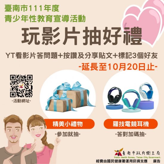 (一)青少年性教育宣導活動 【青春戀習題-玩影片抽好禮】,觀看國民健康署衛生福利部為青少年打造之青春戀習題互動式影片,完成指定步驟即可參加抽獎活動。