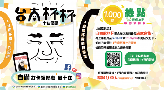 (二)消費當日回傳截圖或貼文連結至「台南杯杯」Line@官方帳號( ID: @328idvap ),經確認無誤後,一週內會透過 Line 訊息提供環保綠點 1,000 點(等值新臺幣 10 元)兌換資訊。