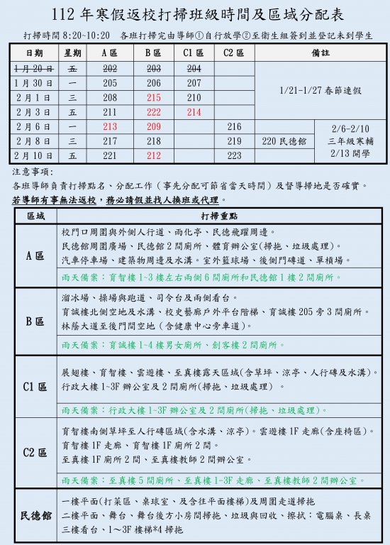打掃班級同學當天有事,需事先向班級導師請假,並提前來電告知衛生組登記返校打掃日期。 登記補掃同學請於 8 : 20 前至衛生組集合並分配工作。
