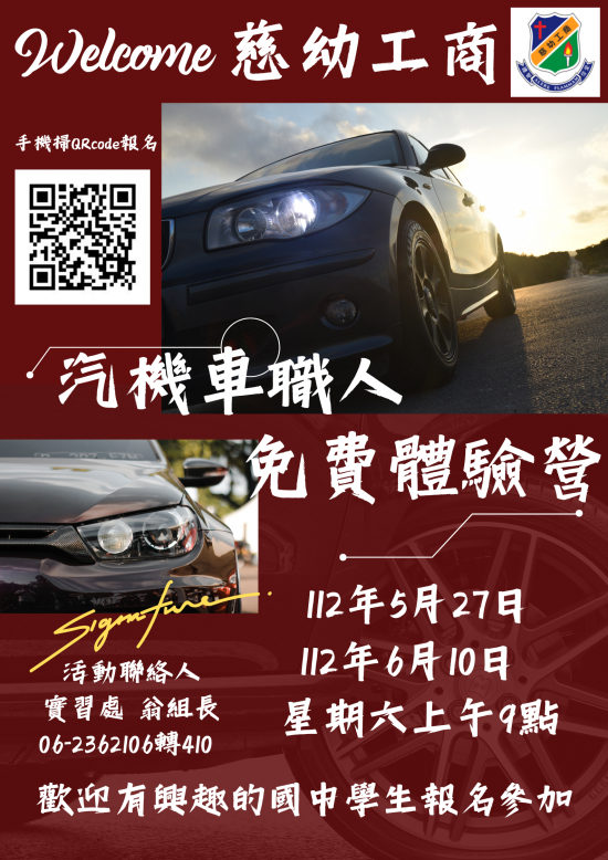 九、報名方式:請洽慈幼工商實習組翁如慧組長(06)2362106 分機 410 。或填寫線上報名表,網址: https://forms.gle/99GwVukNJKkg5qb8A 。