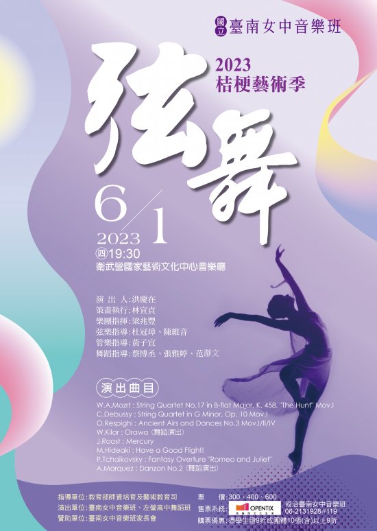 一、本校音樂班訂於 112 年 6 月 1 日(星期四) 19 時 30 分假衛武營國家藝術文化中心音樂廳舉辦「2023 桔梗藝術季-弦舞」音樂會,特地邀請高雄市立左營高中舞蹈班與本校管弦樂團合作演出,讓純粹古典聽覺的音樂會瞬間轉化為動感的視覺效果,期望觀眾能在國家級的音音樂廳聆聽優質的古典音樂,同時能觀賞動感現代的肢體展現,在視覺與聽覺上獲得雙重享受。演出曲目請參閱海報。 二、本場次需購票入場, 8 折優惠劵請洽臺南女中音樂班( 06-2131928*119 )