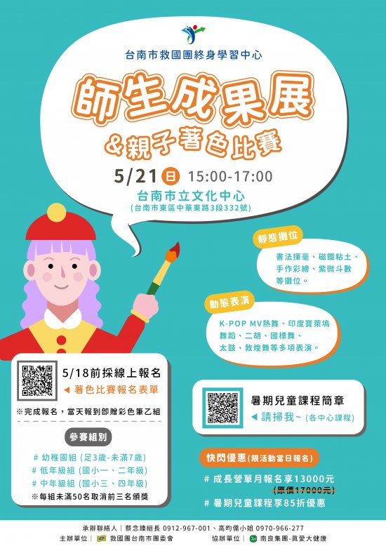 救國團 5 月 21 日(週日)辦理師生成果展,時間:15:00-17:00 ,歡迎您的蒞臨,現場也有親子著色比賽,請協助轉發資訊,含海報、報名連結,謝謝!!